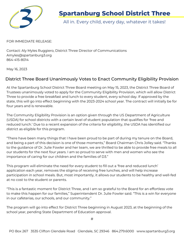 At the Spartanburg School District Three Board meeting on May 15, 2023, the District Three Board of Trustees unanimously voted to apply for the Community Eligibility Provision, which will allow District Three to provide a free breakfast and lunch to every student, every school day. If approved by the state, this will go into effect beginning with the 2023-2024 school year. The contract will initially be for four years and is renewable.
