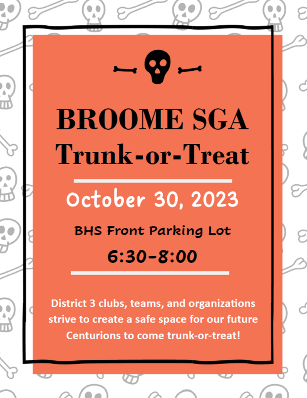 Broome SGA invites you to its Trunk-or-Treat event! Monday, October 30th in the BHS front parking lot from 6:30 pm to 8:00 pm. D3 clubs, teams and organizations strive to create a safe space for our future Centurions to come trunk-or-treat!